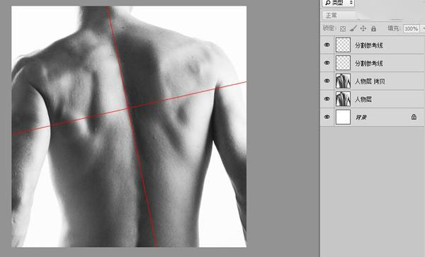 3、来到人物拷贝层,用多边形套索工具,沿着红色参考线,把此图层切割成四块,并重新调整好四块皮肤的位置,再把参考线删除: